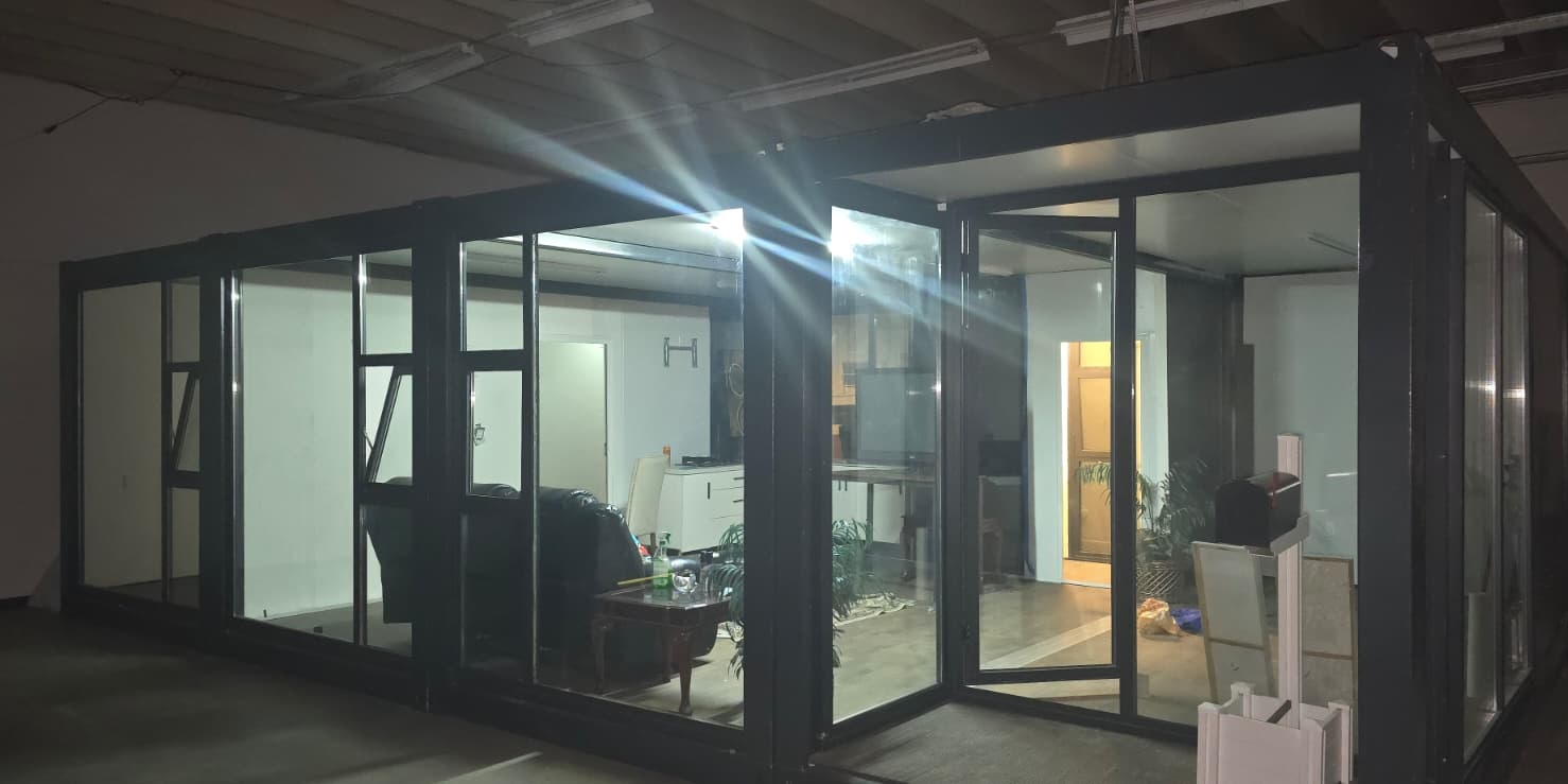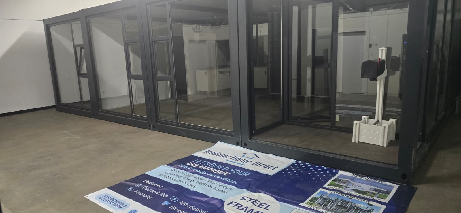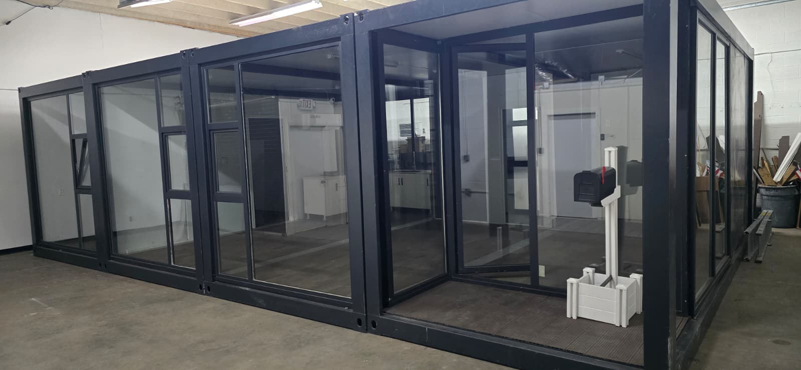 - Four steel modules (approx. 160 sq ft each; ~640 sq ft total)